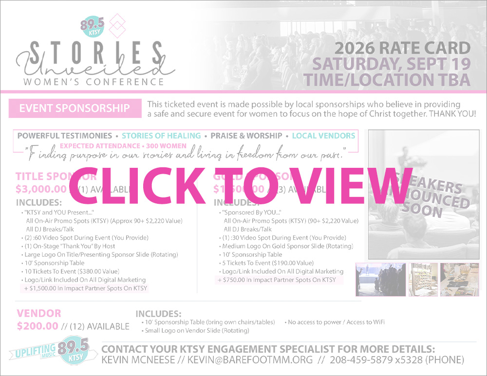 If you are a business or ministry wanting to partner with us on our Fall 2026 Stories Unveiled Women’s Conference on Saturday, September 19, 2026, click here to access the current sponsorship opportunities or click here to schedule a call with us. We’d love to hear more about your goals and objectives, and to discuss the latest sponsorship opportunities we have.